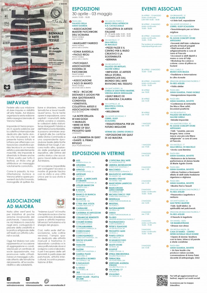 La mostra itinerante 'Ricucire distanze e luoghi. Per una quotidianità condivisa (RiCu)' sarà esposta dal 30 aprile al 3 maggio nella bouvette della Gran Guardia (piazza Bra) nell'ambito della Biennale d'arte tessile (Veronatessile 2023) intitolata IMPAVIDE.