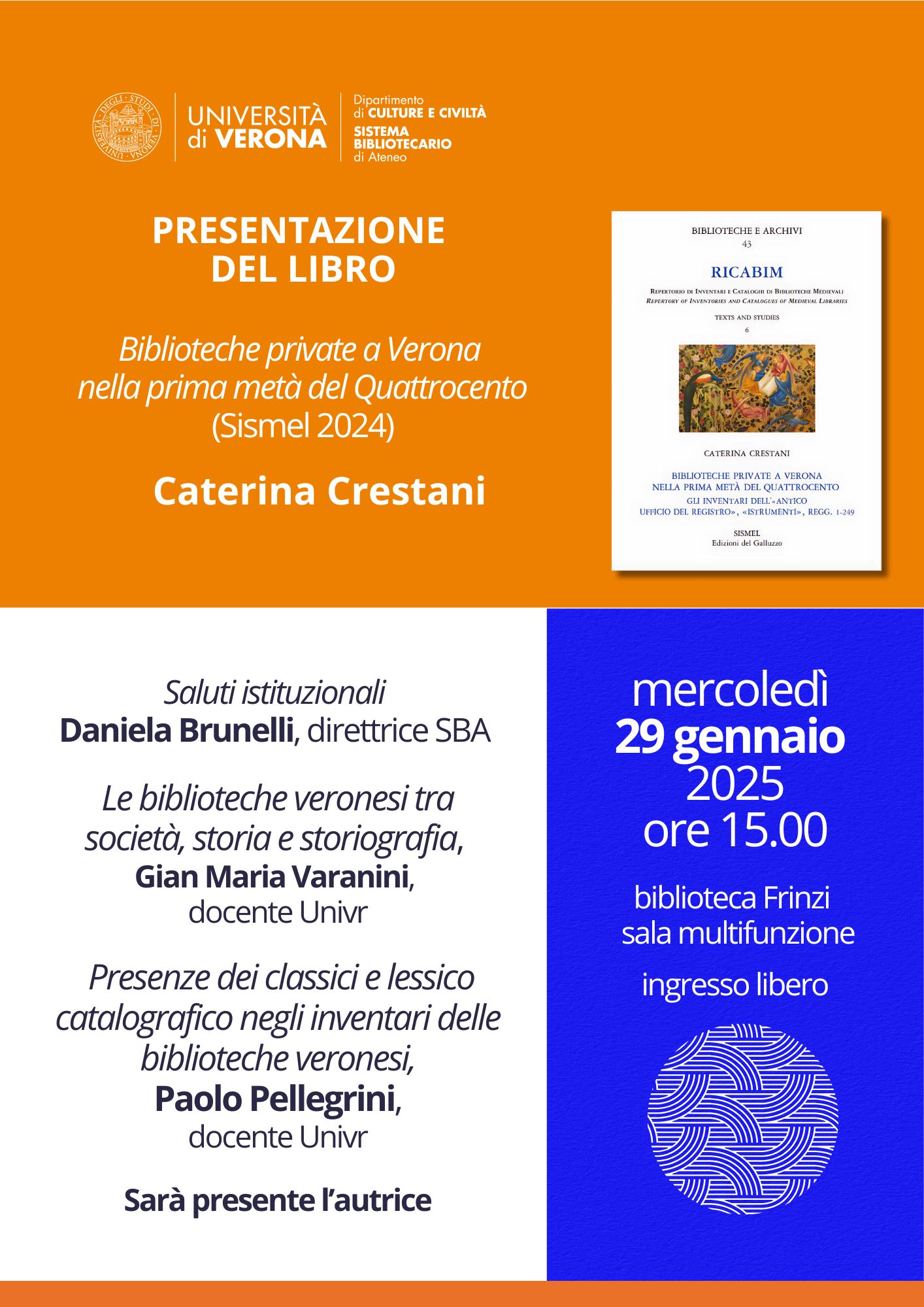 Presentazione del libro di C. Crestani, Biblioteche private a Verona nella prima metà del Quattrocento