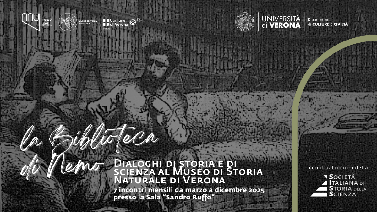 Il palinsesto La Biblioteca di Nemo. Dialoghi di storia e di scienza al Museo di Storia Naturale di Verona, realizzato dal Museo di Storia Naturale in collaborazione con il Servizio Biblioteche Specialistiche e Archivi Storici dei Musei e il Dipartimento Culture e Civiltà dell'Università di Verona, si propone di presentare al pubblico testi di recente e recentissima pubblicazione scritti e curati da specialiste e specialisti i cui interessi di ricerca intrecciano i terreni di indagine del Museo di Storia Naturale, con un occhio di particolare riguardo per il taglio comunicativo, interdisciplinare e storicizzato del sapere scientifico.