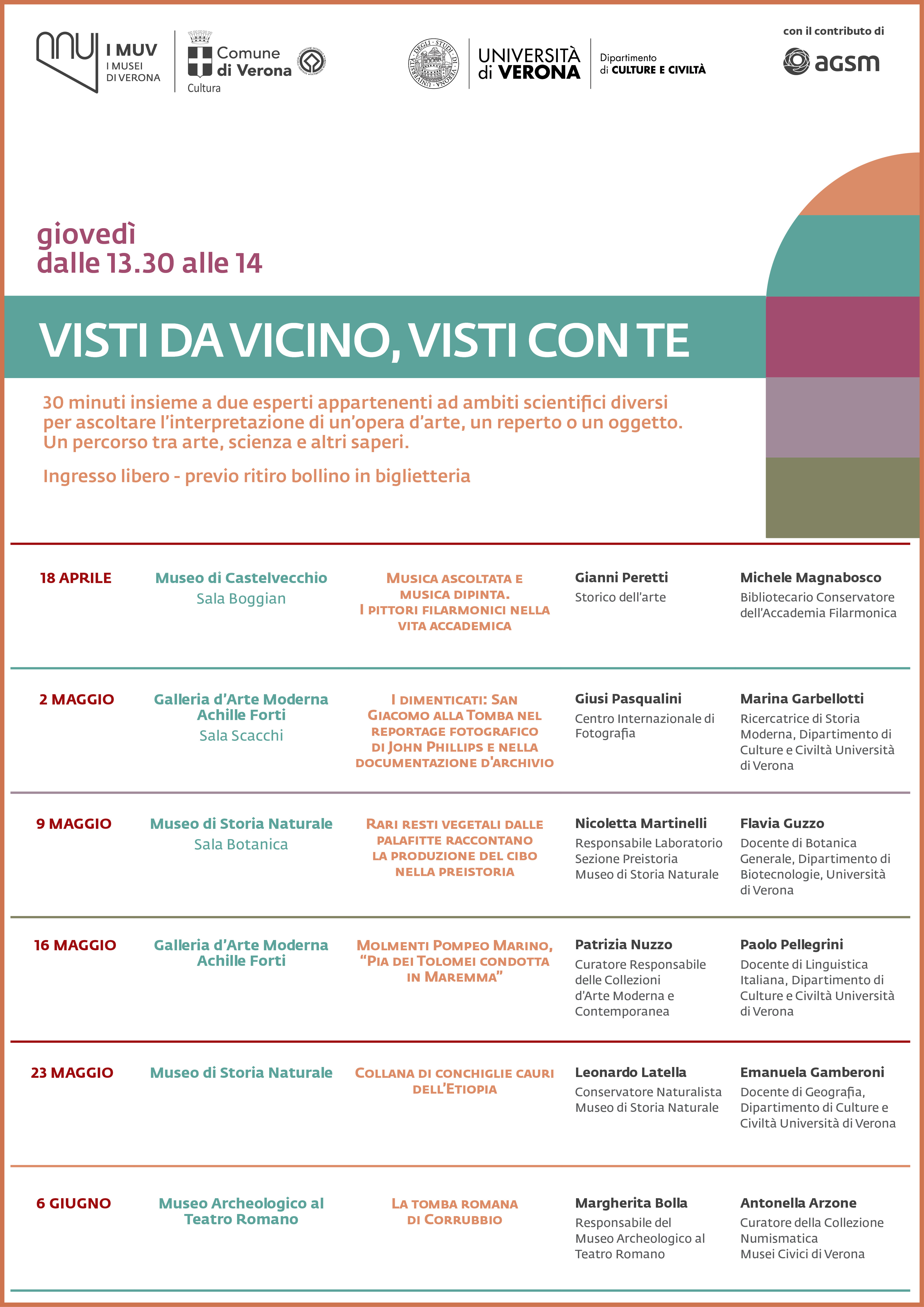 “Visti da vicino, visti con te” è il titolo della nuova iniziativa promossa dai musei di Verona, in collaborazione con l’università, dipartimento di Culture e civiltà, e il supporto di Agsm. Da giovedì 18 aprile, cittadini e curiosi potranno trascorrere 30 minuti insieme a due esperti appartenenti ad ambiti scientifici diversi, per ascoltare l’interpretazione di un’opera d’arte, un reperto o un oggetto. Un percorso tra arte, scienza e altri saperi da gustare nei musei della città, durante la pausa pranzo. Gli appuntamenti si susseguiranno fino al 6 giugno, sempre dalle 13.30 alle 14.